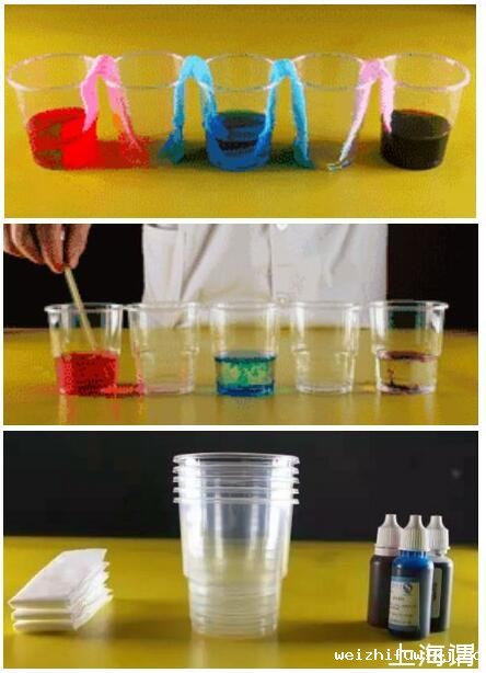 实验材料:纸巾、透明杯子、色素(红、绿、蓝或任意三种颜色)