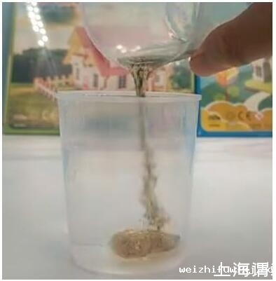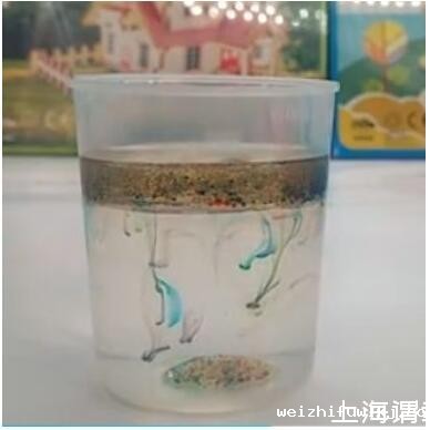 解密时刻:水不溶于油且水比油重,颜料在油中会下沉,下沉到水油交界面时,颜料溶于水中,于是就看到了彩虹雨。