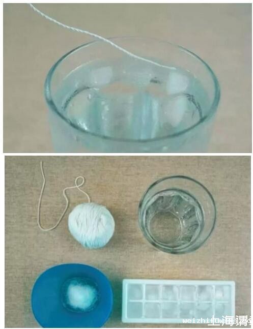 实验材料:一杯水、冰块、绳子、食用盐