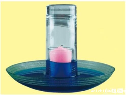 解密时刻:当蜡烛熄灭时,玻璃杯中的水会逐渐上升,上升到一定程度后,停止。因为蜡烛燃烧,消耗了玻璃杯中的氧气,减少的这部分氧气被水填充。