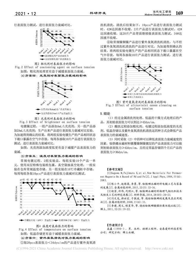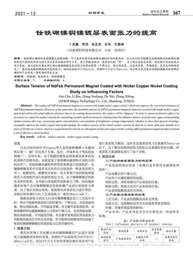 摘要:钕铁硼永磁材料表面镀覆光亮镍铜镍,可以很好的增加钕铁硼永磁材料的耐腐蚀性;但与此同时对镀覆光亮镍铜镍的钕铁硼永磁材料进行装配使用的过程大多会采用粘接的固定方式,由于其镀层特性,表面会比较"滑",为了保证其固定效果,就需要对其表面张力进行管控。通过控制变量法研究确认镍铜镍镀层表面张力的影响因素(干燥方式、粗化剂浓度、光亮剂浓度、存储温度、是否表明特殊清洗),最终提高镍铜镍镀层的表面张力,初始表面张力≥42dyn/cm,存储四个月后≥36dyn/cm,对后续有张力要求的镍铜镍镀层钕铁硼永磁材料产品形成一套有效的管控方法。