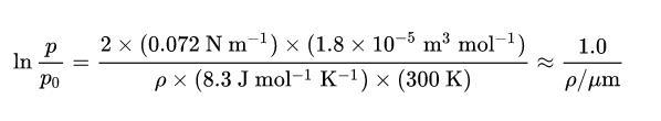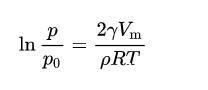 听说公式会让人不想看科普所以我只讲这一个公式好了(x)其中,R是通用气体常量,T是温度,ρ是液滴表面的曲率半径。p₀是表面平整的液体原本的蒸气压,p是这个液滴的蒸气压。p₀、表面张力γ、液体摩尔体积V_m对于同种温度的同种液体可以认为近似是常量。把以上常量合并为常量C,所以在同样温度下,对于同种液体,可以得出如下的半定量关系: