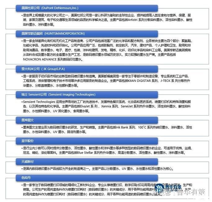 数码喷印墨水市场呈现与数码印花设备市场相近的市场竞争格局,由海外巨头主导市场,如美国杜邦公司、美国亨斯迈集团、意大利JK公司等。从全球范围来看,目前欧洲、北美地区的数码喷印技术仍处于较高水平,是率先对数码喷墨印花技术实现产业化的地区,受益于较高的环保标准和丰富的时尚原创设计产业,欧洲、北美地区的数码印花产品供需旺盛,数码喷印应用产业规模大且普及程度高,全球领先的数码喷印墨水制造商多集中于此,亚太地区则以日本、韩国制造商为主。我国的数码喷印墨水行业起步较晚,企业规模、研发能力以及产品稳定性等方面参差不齐,且主要以中小型企业为主,但随着最近几年国产数码喷印墨水的快速发展,我国也出现了少数综合实力相对较强的专业生产商。国内外主要墨水生产商情况如下: