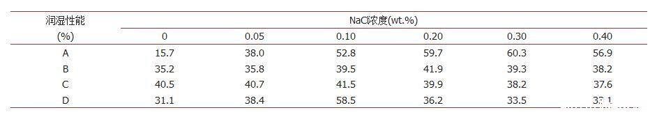 表3.含有不同浓度NaCl的抑尘剂与煤尘NR的润湿性能
