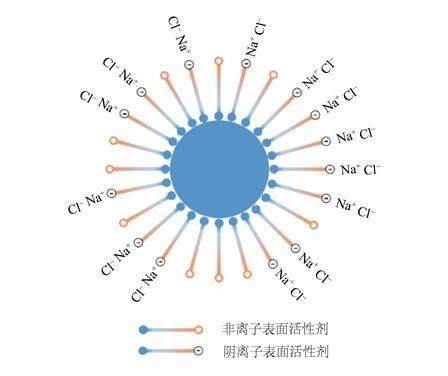 抑尘剂主要由阴离子表面活性剂、非离子表面活性剂以及其他助剂组成。其中,表面活性剂是一种具有两亲性的物质,加入少量能使其溶液体系的界面状态发生明显变化,是抑尘剂的重要组成部分。如图4所示,煤尘表面暴露着大量的极性有机基团,水在煤尘表面很难发生润湿行为;抑尘剂中的表面活性剂亲油端与煤尘表面的有机基团具有较好的相容性,能够在煤尘表面定向排列并且将亲水基团引入煤尘表面,增加了水与煤尘之间的润湿能力。无机盐的引入对于阴离子表面活性剂具有增效作用。根据双电层理论,双电层可以分为紧密层和扩散层,当溶液中加入无机盐后,无机盐中的离子会压缩扩散层,使得扩散层厚度减小,从而降低了界面能;同时其无机盐离子还能减小双电层中的静电力作用,促进了抑尘剂在煤尘表面的吸附,提高了润湿性能。