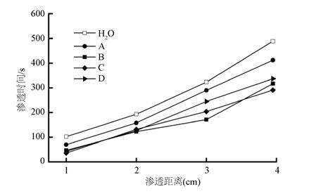 图2.四种抑尘剂溶液在煤尘表面的渗透性能