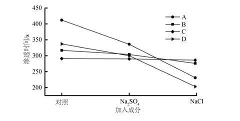 图5.不同浓度NaCl对0.2 wt.%不同类型抑尘剂的渗透性影响