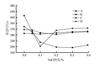 从图4可知,NaCl对于提高抑尘剂润湿性能的作用更为显著。因此,在抑尘剂中加入不同浓度的NaCl,研究无机盐浓度对煤尘NR的润湿性能的影响。如图5所示,少量的NaCl的引入,能够降低抑尘剂在煤尘表面的渗透时间。NaCl的引入能够降低抑尘剂溶液的表面张力,使抑尘剂在煤尘表面的接触角不断降低[18]。另外,无机盐能够增强表面活性物质在煤尘表面的吸附能力,降低煤尘与抑尘剂之间的界面能,提高了抑尘剂对煤尘的润湿性能;煤尘中含有大量的酚羟基、羧基等有机基团,因此煤尘表面呈现电负性[19]。当NaCl含量持续增加时,抑尘剂A、B、C在煤尘表面的渗透时间趋于平稳,而抑尘剂D出现渗透时间增加后平缓的趋势。相比之下,抑尘剂B、C对于NaCl的敏感程度较低,随着NaCl含量增加其润湿能力变化不大;NaCl对抑尘剂A、D在煤尘表面的润湿能力影响程度较大。