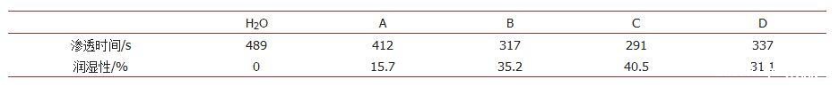 分别选用了四种抑尘剂A、B、C、D,使用正向渗透法研究了抑尘剂对于煤尘NR的润湿能力的影响。如图2所示,在水中加入抑尘剂可以增加在煤尘NR表面的润湿能力,渗透时间大幅降低。四种抑尘剂的润湿能力数据如表1所示,纯水在煤尘表面4 cm的渗透时间为489 s。相比之下,抑尘剂C、B和D均能够较大程度提高对煤尘的润湿能力,渗透时间分别降低至291 s、317 s和337 s,润湿能力相比纯水分别提高了40.5%、35.2%和31.1%。抑尘剂A的润湿能力相对较差,渗透相同煤尘距离所需要的时间为412 s,润湿能力比纯水仅提高了15.7%。