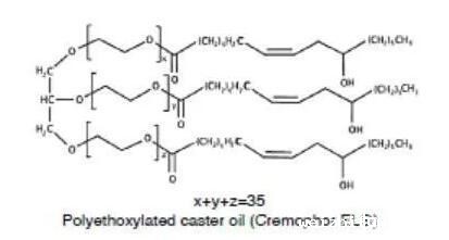 另一类重要的非离子表面活性剂是聚氧乙烯蓖麻油(Cremophor)或聚氧乙烯氢化蓖麻油(Cremophor RH)。蓖麻油是蓖麻油甘油三脂,与环氧乙烯反应,亲水性的氧化乙烯结构便插入到蓖麻酸和甘油之间,便得到了聚氧乙烯蓖麻油,如果蓖麻油中的双键加氢饱和后,再与环氧乙烯反应,那么得到的便是聚氧乙烯氢化蓖麻油。环氧乙烯和蓖麻油的反应位点是随机的,因此得到的表面活性剂是一种混合物,也包括未反应的蓖麻油和均聚形成的聚氧乙烯。不同种类的聚氧乙烯蓖麻油或聚氧乙烯氢化蓖麻油是通过参与反应的氧化乙烯和蓖麻油或氢化蓖麻油的比例决定的,例如Cremophor EL 40或Cremophor RH 40,其中40代表的便是混合物中氧化乙烯和蓖麻油的摩尔比。这类表面活性剂的HLB一般在12以上,常用作难溶性药物的增溶。