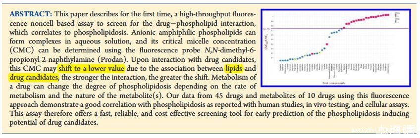 在大多数制药公司的PLD筛选策略中,下一级筛选分析是基于细胞的生物分析,在细胞内使用荧光脂质或亲脂性染料。22-25最近报道了一种基于96孔的基因表达分析26;然而,该测定已被证明不太敏感。22直到最近,还没有基于非细胞的体外筛选测定可用。已经报道了一种高通量langmuir-balance方法,将用测试化合物处理后临界胶束浓度(CMC)的变化与在人类、动物和细胞中观察到的PLD联系起来。27这种方法大大提高了预测质量与计算模型相比,与细胞分析和动物模型相比,增加了吞吐量;然而,这种方法需要使用专门的设备,即八通道表面张力计(Delta 8,Kibron Inc.,Helsinki,Finland),这在大多数实验室中并不容易获得。