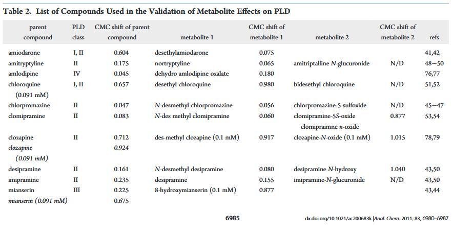 已经有许多出版物描述了PLD药物代谢产物所致。其中,初级代谢轻的胺碘酮,去乙基胺碘酮,已经讨论过14,38-40优先积累代谢物已观察到胺碘酮过量,尤其是短期39这为我们的检测数据提供了可能的解释其中去乙基胺碘酮是胺碘酮的主要代谢物,41,42表现出更高的PLD诱导潜力。相似地,8-羟基米安色林之间的CMC位移差异,米安色林、43,44和米安色林的主要氧化代谢物比其他两个之间的差异更显着成对的亲本和代谢物。由于溶解度的限制,父母和代谢组的剂量浓度不同氯氮平和米安色林。这可能是导致观察到的CMC偏移的显着差异母体和代谢物之间。在较低浓度下测试时相比之下,氯氮平从低电位诱导剂转变为非诱导剂,而米安色林仍然作为诱导剂但具有更高的CMCDL/CMCL值。值得注意的是,目前测试集中的大多数CAD被报告为氧化代谢其相应的脱烷基初级代谢物。为了了解相应初级的PLD电位代谢物,我们测试了额外的代谢物。之间测试的代谢物是初级去甲基代谢物氯丙嗪、45?47阿米替林、48?50丙咪嗪、43,50和pri-氯喹的玛丽和次级脱乙基代谢物。51,52此外,由杂原子氧化形成的氧化代谢物地昔帕明43,50和氯胺酮的重释和脱烷基代谢物pramine53,54进行了评估。与其他CAD一样,代谢物可以如果它们具有合适的理化性质,则诱导PLD。32相反,代谢物将失去结合能力如果CAD特征丢失,则使用脂质,例如用脂质观察氯米帕明N-氧化物和地昔帕明N-羟基(图4和表2)。