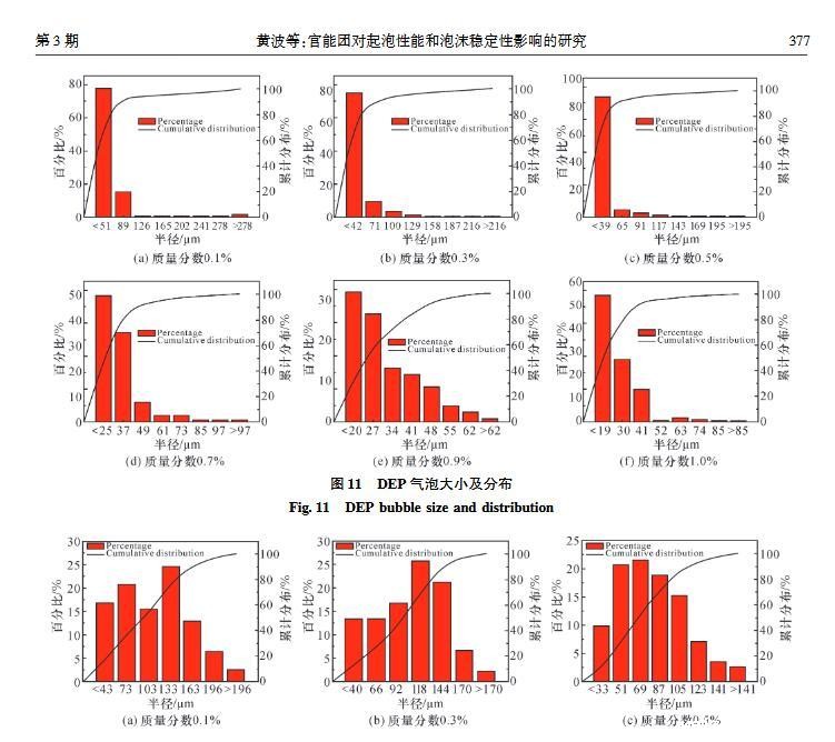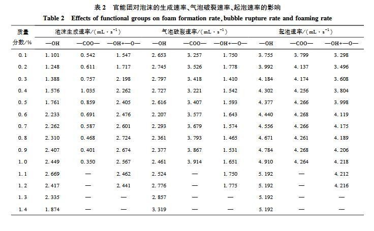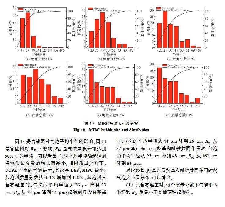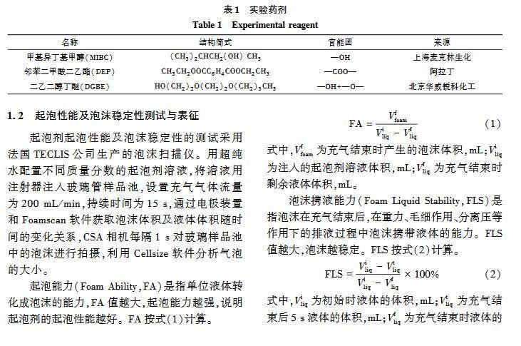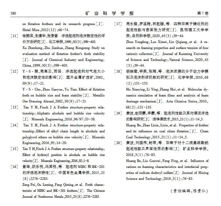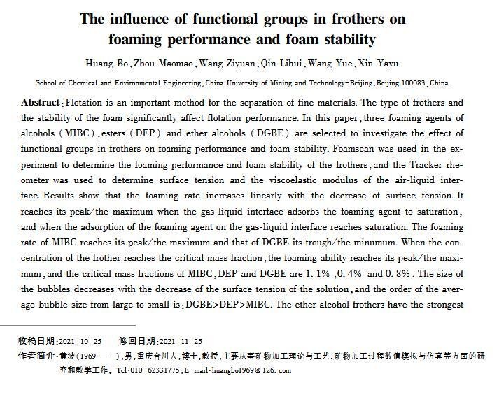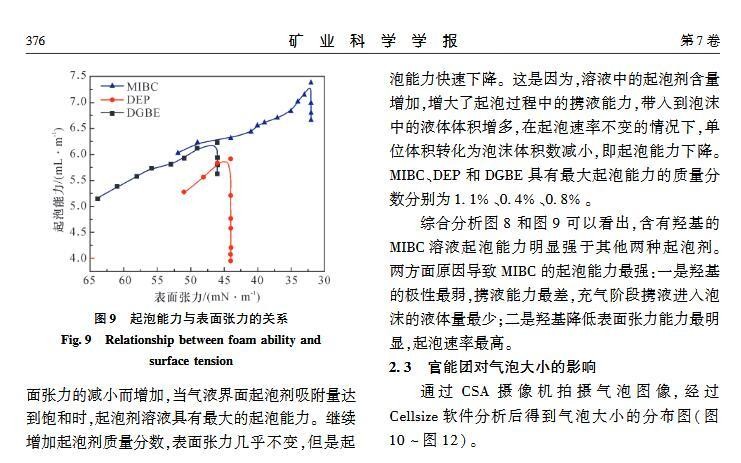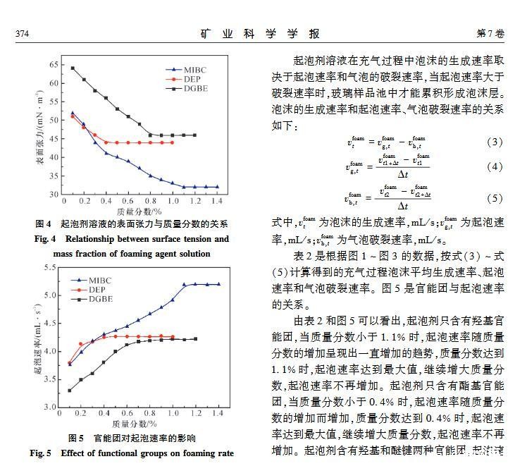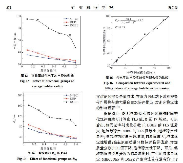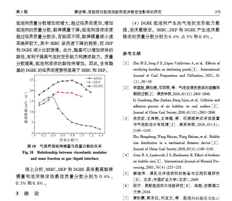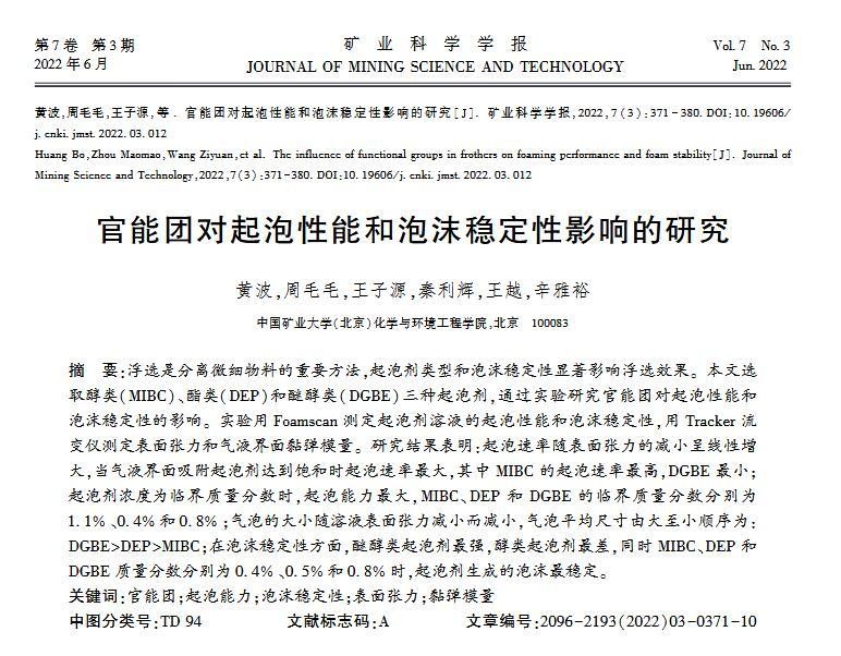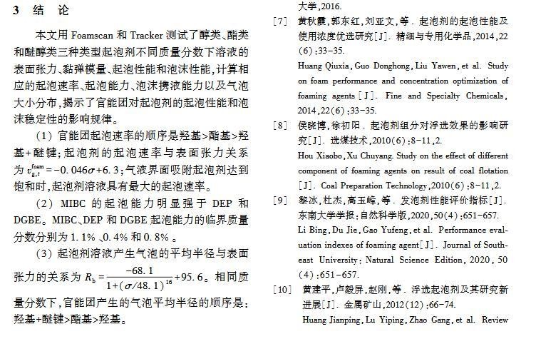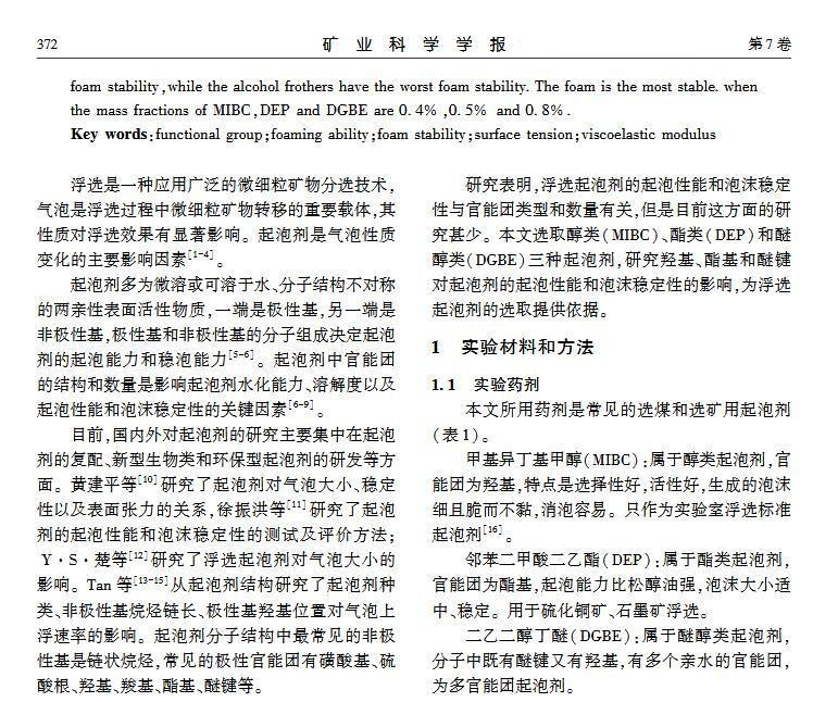 【摘要】:浮选是分离微细物料的重要方法,起泡剂类型和泡沫稳定性显著影响浮选效果。本文选取醇类(MIBC)、酯类(DEP)和醚醇类(DGBE)三种起泡剂,通过实验研究官能团对起泡性能和泡沫稳定性的影响。实验用Foamscan测定起泡剂溶液的起泡性能和泡沫稳定性,用Tracker流变仪测定表面张力和气液界面黏弹模量。研究结果表明:起泡速率随表面张力的减小呈线性增大,当气液界面吸附起泡剂达到饱和时起泡速率最大,其中MIBC的起泡速率最高,DGBE最小;起泡剂浓度为临界质量分数时,起泡能力最大,MIBC、DEP和DGBE的临界质量分数分别为1.1%、0.4%和0.8%;气泡的大小随溶液表面张力减小而减小,气泡平均尺寸由大至小顺序为:DGBEDEPMIBC;在泡沫稳定性方面,醚醇类起泡剂最强,醇类起泡剂最差,同时MIBC、DEP和DGBE质量分数分别为0.4%、0.5%和0.8%时,起泡剂生成的泡沫最稳定。