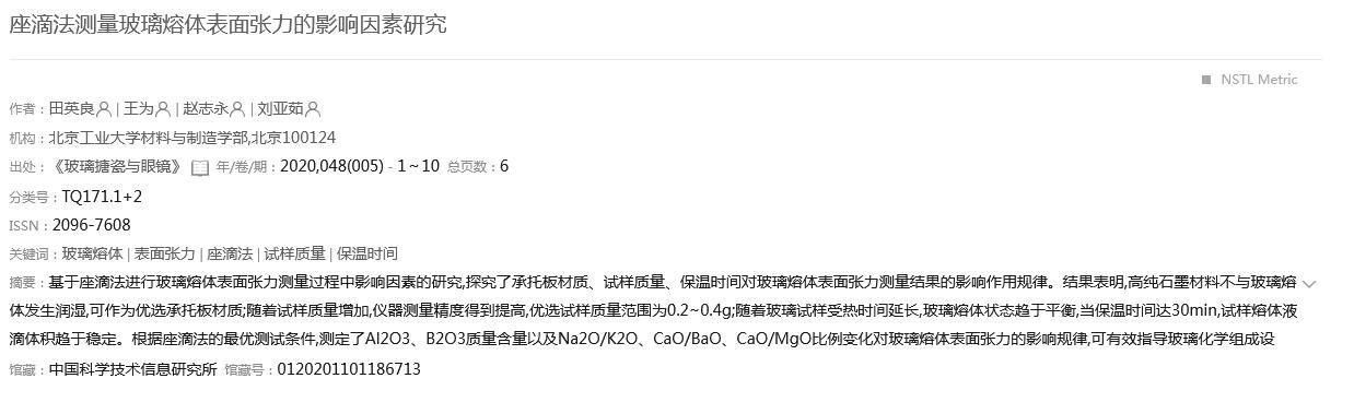 座滴法测量玻璃熔体表面张力的影响因素研究