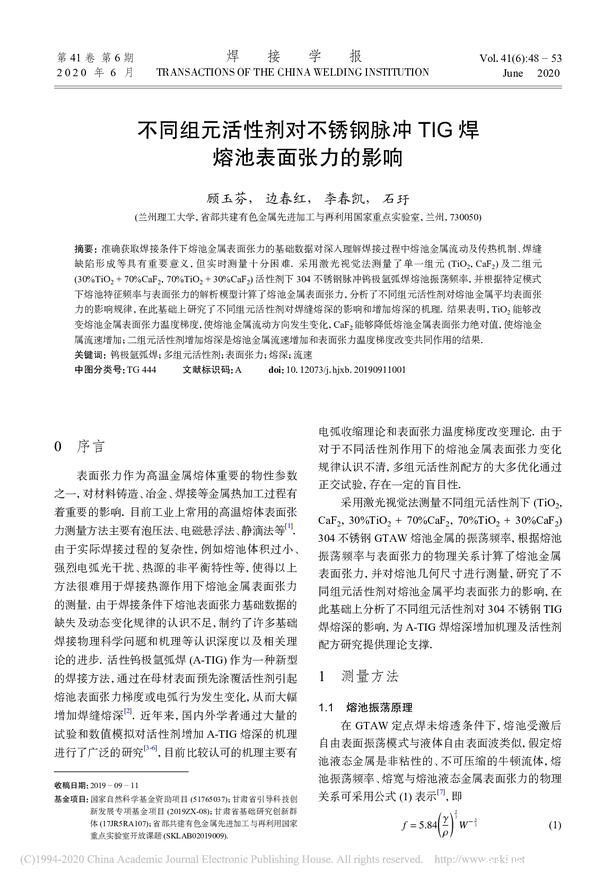 不同组元活性剂对不锈钢脉冲TIG焊熔池表面张力的影响
