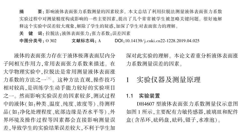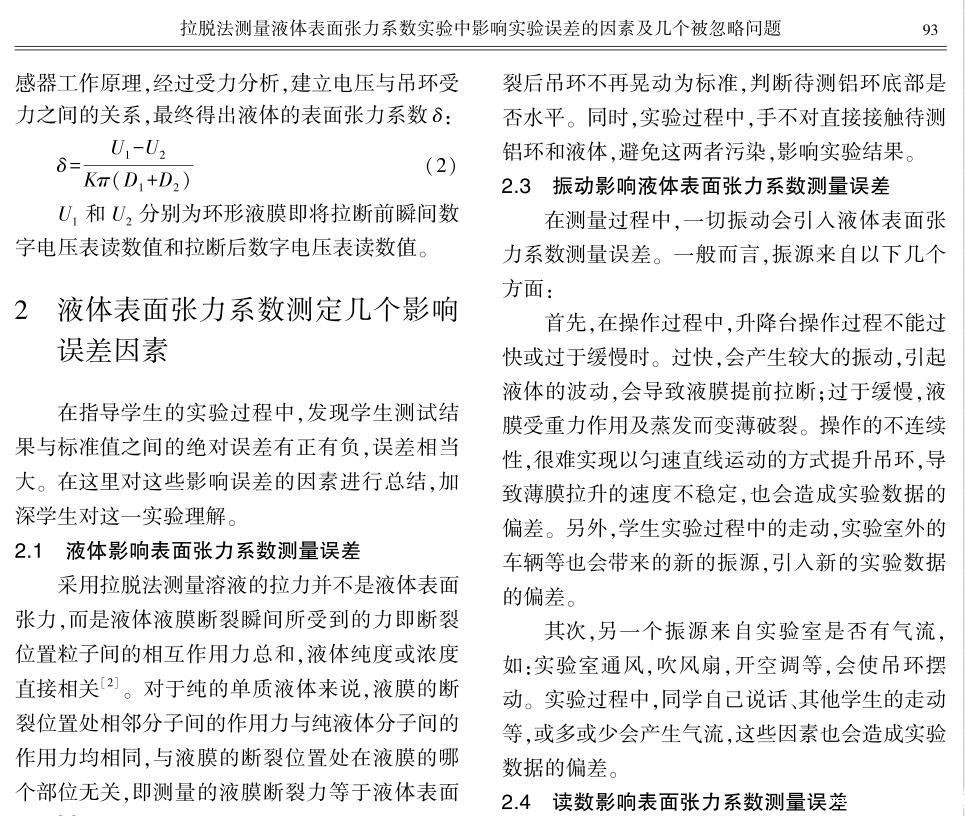 【摘要】:本文对拉脱法测试液体表面张力系数中吊环的水平、液膜质量、传感器定标范围和电压测量点四个造成实验误差的相关因素进行分析。采取带有水平仪的轻质三角形薄片对吊环进行简单改进,使纯水的表面张力系数百分误差减少了3.97%。并结合教学经验,对学生实验过程中易忽视问题进行详细说明,希望为进一步的物理实验教学提供借鉴意义。