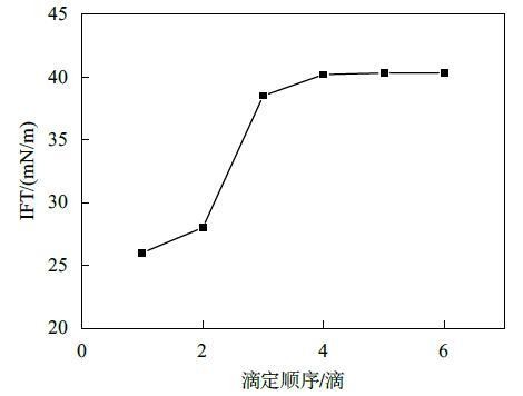 结果表明,液滴悬置5 min后,第一滴液滴表面张力值最小,随着连续滴定的进行,液滴表面张力值逐渐增大,最终趋于平衡。究其原因,可能是由于悬置一段时间后,表面活性剂分子在表面充分吸附,所以第一滴液滴表面张力最小,而随着连续滴定进行,由于平衡时间较短,表面活性剂分子在液滴的表面吸附未达平衡,所以数值逐渐增大,然而滴加液滴的速度一定,表面活性剂分子在表面的迁移速率一定,降低表面的能力与效率一定,最终会达到一个稳定值。而平衡时间的长短,与表面活性剂分子的性质有关,迁移吸附速率快的表面活性剂分子所需时间较短。由此可见,使用悬滴法测定表面张力时,时间效应的影响不可忽略。