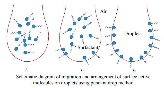 时间效应会对结果产生影响,根据测定结果与时间的关系,表面张力又可分为静态表面张力与动态表面张力,静态表面张力通常指在界面达到吸附平衡时的最低表面张力,常见的测定方法如拉环法[7]、平板法[8]、毛细管上升法、滴体积法等均可静态测定。而动态表面张力是表面张力随时间的变化趋势,记录的是表面活性剂在达到吸附平衡过程中每一时刻的表面张力值[9],是一组动态变化的值。测定动态表面张力的主要方法有悬滴法[10]、最大气泡压力法[11]、平板法[12]等。