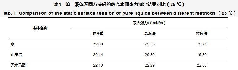 表1单一液体不同方法间的静态表面张力测定结果对比(25℃)