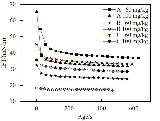 为了充分证明时间效应对悬滴法测定结果会造成影响,实验使用悬滴法对A,B,C三种表面活性剂复配溶液较稀含量下的动态表面张力进行了研究。结果如图3所示。