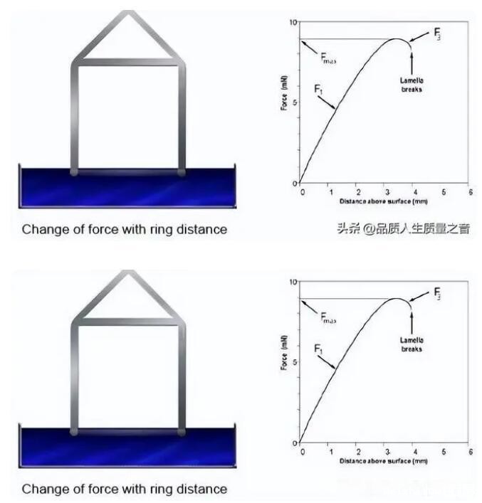 由于距离不同表现出的表面张力也不同,因此测量往往取最大值,也就是右方图中的Fmax