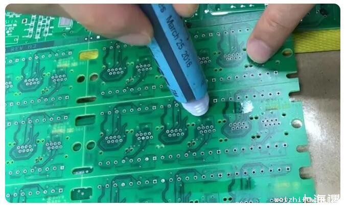 测量PCB表面的张力主要是通过便携式的测试笔,里面含有特定的张力测试液体,像是通常我们使用的大头油性笔似的,测试时只要轻轻在需要测试的表面画一条直线,待2-3秒钟过后,观察画的直线是否附着均匀,没有收缩成水珠状,说明达到了该测试笔设定的张力,张力的单位为达因/厘米(dyne/cm),有时又称测试笔为达因笔。具体测试笔品牌这里就不给做广告了,这个测试在市面上也很容易买到。测试的方法也比较简单,为了确定张力的范围,一般必须准备至少2只测试,一般测试的张力区间在+/-2达因/厘米之间。