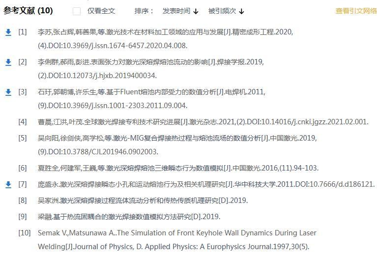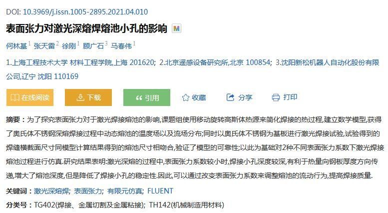 【摘要】:为了探究表面张力对于激光焊接熔池的影响,课题组使用移动旋转高斯体热源来简化焊接的热过程,建立数学模型,获得了奥氏体不锈钢深熔焊接过程中动态熔池的温度场以及流场分布;同时以奥氏体不锈钢为基板进行激光焊接试验,试验得到的焊缝横截面尺寸同模型计算结果得到的熔池尺寸相吻合,验证了模型的可靠性;以此为基础对2种不同表面张力系数下激光焊接熔池过程进行仿真。