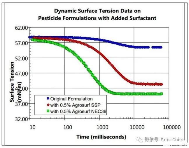 例如我们用KRSS的BP100动态表面18luck国际测试添加了两种不同表面活性剂农药的动态表面张力。喷雾过程中尺寸效应的关键因素为初始表面张力降低的快慢,即通常认为是液滴形成后前250ms内的表面张力。从这个尺度来看,上述两个皆不是优异的表面活性剂。