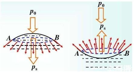 图3、4中虚线圆周处的红色小箭头代表表面张力方向,p0代表大气压,ps代表表面张力合力,即:附加压力。由图3、4可以看出弯曲液面表面张力的合力(附加压力)不为0,其方向均指向弯曲液面的曲率中心。