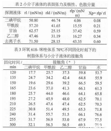 表2为实验所用小分子液体的表面张力及极性、色散分量,表3为环氧618-咪唑体系70℃不同固化时刻下的树脂体系与小分子液体的接触角。