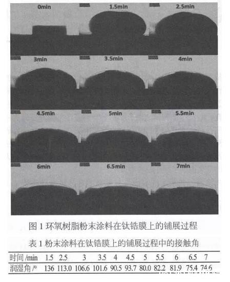 杨雲予等人利用接触角测量仪在恒温180℃下,拍出了不同时刻圆柱状粉末涂料在铝合金钛锆膜上的熔融和铺展过程图,并记录了的润湿角,为研究粉末涂料固化过程中,凝胶前的接触角变化提供了依据。
