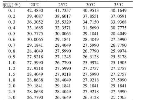 由表1可以明显看出,同一温度下,黄花败酱皂甙的表面张力随浓度的增大而显著下降,同一浓度下随温度升高,表面张力下降。高温时表面张力下降比较明显,浓度为2.0%时表面张力不随温度变化而变化。cmc约为1%,σcmc约为(25~27)×10-3(N·m-1)。黄花败酱皂甙符和表面活性剂的定义,浓度变化很小,表面张力下降很大下降到临界胶束浓度再增加浓度表面张力也不下降。