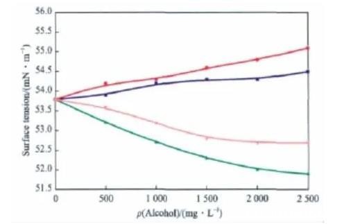 本工作采用乙醇、正丁醇、乙二醇、1,2-丙二醇、正辛醇和十二醇为添加剂,研究了不同醇对BHEC水溶液表面张力的影响。