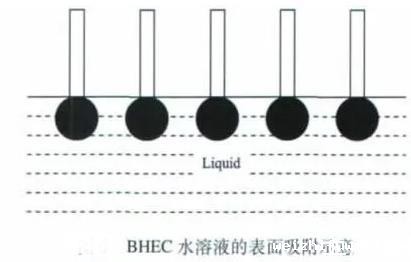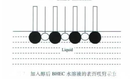 乙醇和正丁醇属于一元醇,这两种醇的加入能使BHEC水溶液的表面张力减小。当未加入一元醇时,BHEC溶于水后,BHEC分子能自发地吸附在溶液的表面,使溶液的表面张力降低,表面吸附的BHEC分子越多,溶液表面张力的降幅越大,当然这其中有一个吸附饱和的问题。但由于BHEC分子在水中处于空间交联网络结构,其定向排列时分子间存在一定的空间(见上图)。加入乙醇或正丁醇后,醇分子可以插入BHEC分子间的空隙,使溶液表面吸附的分子达到紧密排列的状态(见下图),导致BHEC水溶液的表面张力继续降低。