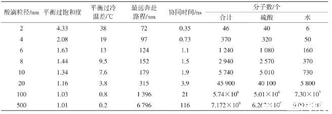 若冷凝酸初始粒径为8 nm,由2 940个分子组成,平衡过饱和度1.44,酸滴表面饱和蒸气压增大44%,对应的平衡过冷温差9.5℃。在超额过饱和温差10.5℃下,等于气相过冷了约20℃,平衡过饱和度、超额过饱和度各半,此时酸滴中分子最远奔赴路程150 nm,对应的协同时间是1.5 ns,酸滴间最近距离是0.3μm。
