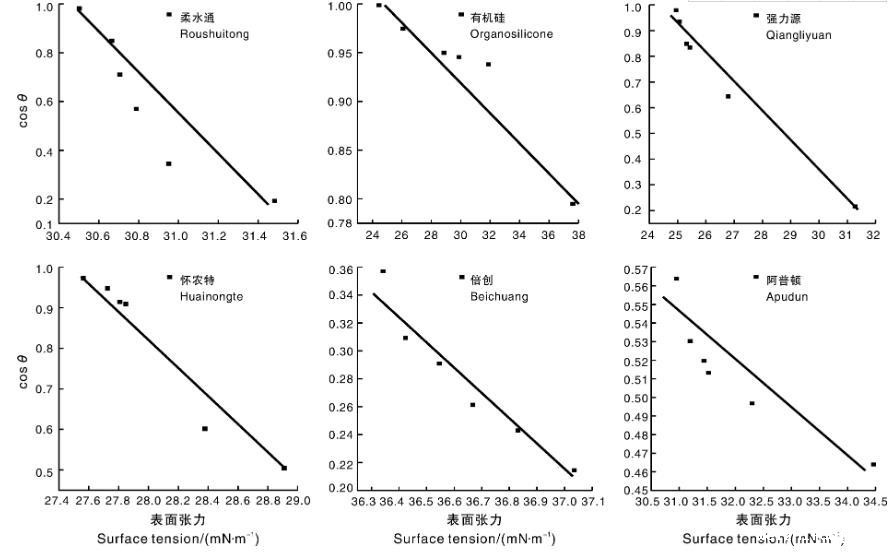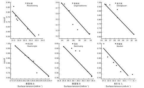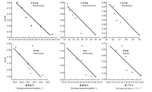 吡虫啉药液、 阿维菌素、苦参碱表面张力与接触角的关系
