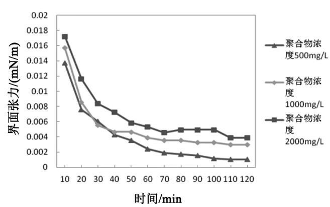 在石油磺酸盐浓度为0.1%,模拟污水矿化度4200 mg/L,碳酸钠浓度0.6%条件下,分别测定聚丙烯酰胺浓度为500、1000和2000 mg/L的复合体系随时间变化的界面张力值,结果如图2所示。