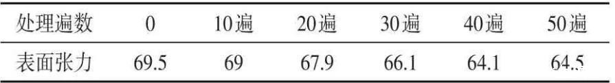 由图表分析可知,自来水经过不同遍数处理后,其表面张力值均有所下降。磁场强度为1.0 T时,下降幅度范围为1.0~3.0 mN·m-1。处理50遍时,水的表面张力减小的幅度约为3.1,相对于自来水的表面张力减小了4.5%;当水被处理30遍到40遍时,水的表面张力的下降速率出现明显减缓的趋势,水的表面张力仅仅减小了0.1 mN·m-1,相对于水被处理20遍到30遍时表面张力下降值的百分比为12.5%。