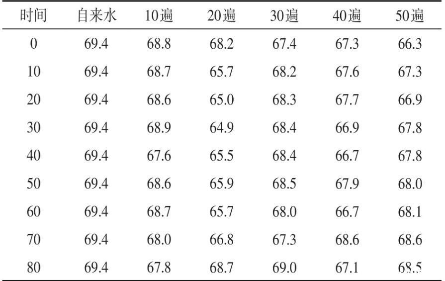 表2磁场强度为1.2 T时磁化水表面张力随遍数的变化值mN·m-1