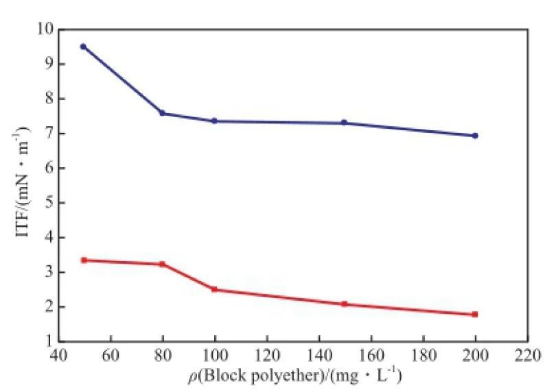 首先配制不同质量浓度(ρ=50,80,100,150,200 mg/L)的嵌段聚醚水溶液,分别测定35℃下的界面张力(γ),绘制γ-lnρ标准曲线。