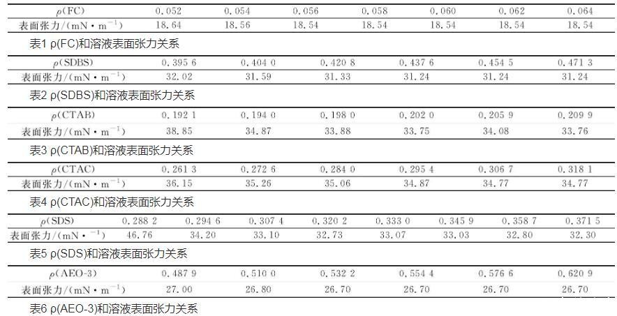 由表1~6可见,不同表面活性剂的临界胶束浓度为:FC为0.056 0 g/L,AEO-3为0.532 2 g/L,SDBS为0.437 6 g/L,CTAB为0.202 0 g/L,CTAC为0.306 7 g/L,SDS为0.320 2 g/L,CMC由小到大顺序为:FC