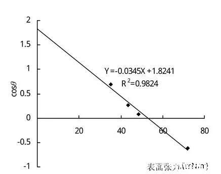 参照Zisman作图法,选取洁净、无病斑的剑麻叶片,用刀片切成规则平整的小块(避开叶脉),用胶水将其固定在载玻片上,使用微量注射器分别吸取2μL已知表面张力的液体(乙二醇、DMSO、DMF和去离子水),点滴在剑麻叶片表面,置于接触角测量仪上,记录此时液滴所成的接触角θ,每个处理重复10次,取平均值。以这4种液体的表面张力值为横坐标,cosθ为纵坐标,得到一条直线回归方程,在cosθ=1(接触角为0)处得到相应的表面张力值即为剑麻叶片的临界表面张力值。