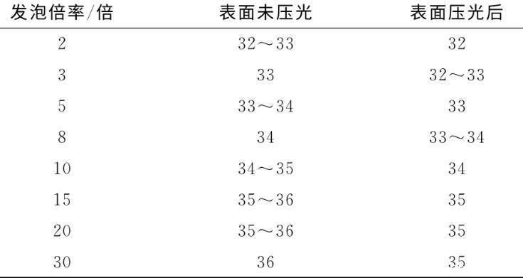 由表2可看出,随着发泡产品倍率提高,材料表面张力会增加。发泡材料的微观泡孔结构,改变了表面特性,增加了液体的润湿,发泡倍率加大,单位体积内泡孔数增加,表面泡孔结构更利于浸润。发泡材料刚完成发泡后,其表面张力小于发泡前对应的母片,这是因为发泡在高温下进行,使得表面进行了结晶融化和重新结晶,改变了前期辐照交联引起的表面变化。同一材料,若表面压光处理后,表面张力会略有下降,这是因为压光改变了材料表面的泡孔形态,形成了一层平整表皮,不利于液体的浸润。
