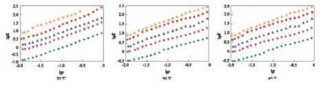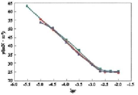 在lgc=-3.00时,可看出较完整的动态表面张力降低曲线,开始时表面张力接近溶剂的表面张力,随时间的延长表面张力先快速下降,降至一定数值后,降幅趋缓,在一段时间内基本保持不变。因为气/液界面新生成时,GSS362尚未在表面吸附,界面张力为溶剂的表面张力,随着时间的延长,表面活性剂分子开始在表面吸附,气/液界面张力降低,随着吸附的进行,表面逐步趋于饱和,表面活性剂分子在表面吸附的速率下降,因而动态表面张力下降速率变慢,趋于平衡。