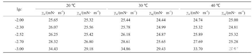 采用JK99C型表面18luck国际由低浓度至高浓度测定恒温后系列溶液的表面张力(γ),做γ-lgc(c为浓度)曲线。测试均在带有恒温夹套的玻璃杯中进行,外接数控超级恒温槽,温度控制在预设温度,温度选择为20,30,40℃。