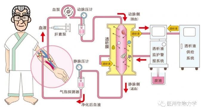 血液透析是急慢性肾功能衰竭患者肾脏替代治疗方式之一。通过将体内血液引流至体外,经一个由无数根空心纤维组成的透析器中,血液与含机体浓度相似的电解质溶液(透析液)在一根根空心纤维内外,隔着半透膜进行透析,通过弥散、超滤、吸附和对流原理进行物质交换,清除体内的代谢废物、维持电解质和酸碱平衡;同时清除体内过多的水分,并将经过净化的血液回输的整个过程称为血液透析。