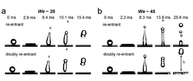 由于较低的表面张力,油滴很容易在固体表面铺展润湿,从而降低整个体系的界面自由能,因此,实现低表面扎张力的超排斥相对来说比较困难。为了实现低表面张力油的超排斥,目前有相关研究人员提出了双内凹结构,通过双内凹结构能够有效锁定固-液-气三相接触线,阻止液体沿着表面微结构向下滑移,从而将液体支撑在微结构空气层上面而实现对不同液体的有效排斥。