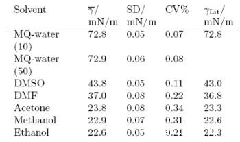 下表列举了几种广为人知的溶剂的表面张力数据来阐述了Kibron传感器的准确性和精确性,每种溶剂都连续测定5次并且利用常规的统计学方法来分析相关数据。对表面张力的均值进行了一个比较,结果和文献值是相一致的。