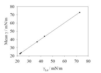 对上述数据进行了线性拟合(下图),相关系数可以达到0.999,证明了在整个表面张力范围内Kibron传感器的极好的准确度。